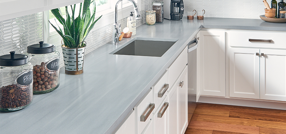 We have been carrying Wilsonart Quartz surfaces for some time. Now we are also offering Wilsonart Solid Surface to our customers. We are still waiting on our full size display, but we have samples of all of the colors if you are interested. Look at these beautiful kitchens that have used the Wilsonart Solid Surface! I LOVE the Silver Smoke!!! It looks awesome on those white cabinets and against that tiled backsplash!
