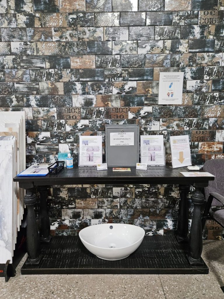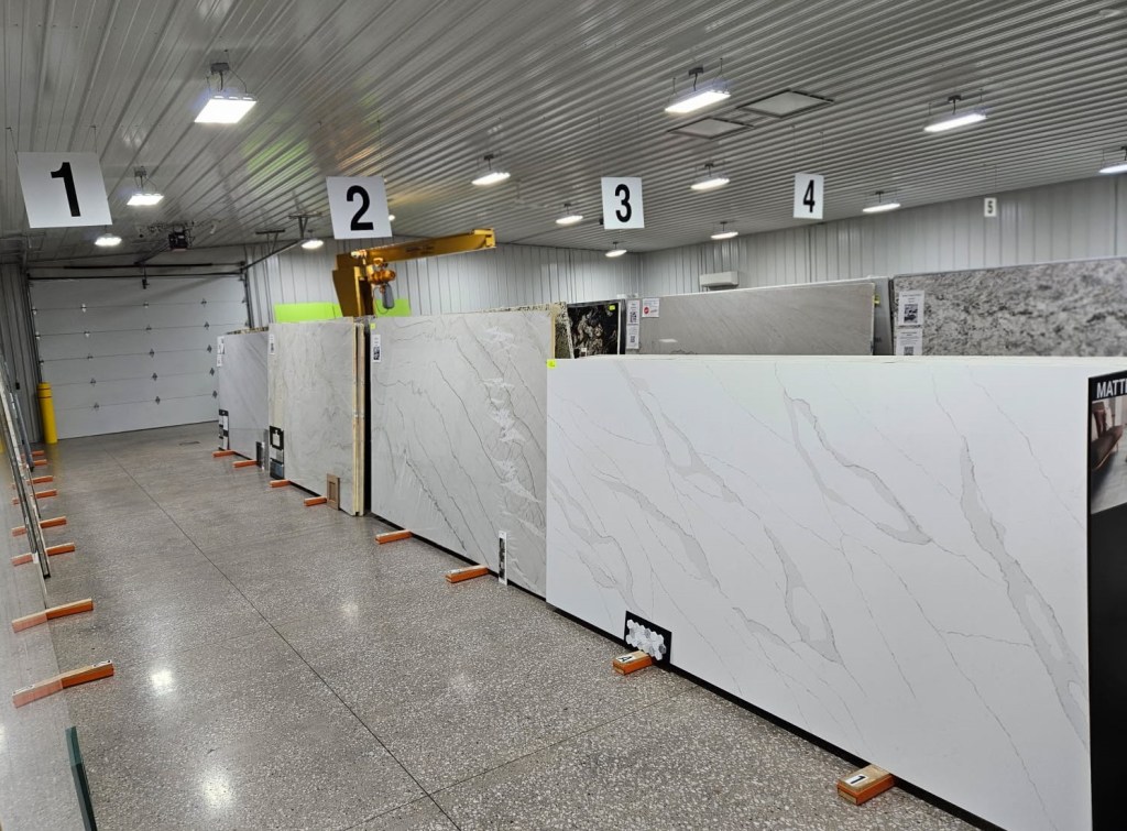 For our customer’s convenience, we have put up a new indoor slab yard so that you can come in and browse when it works for your schedule. Inside our slab yard you will find beautiful slabs of granite and quartzite that have been hand selected by Scott. You will also find in-stock quartz slabs, samples of quartz that we can order for your countertops, sinks, and a variety of backsplash and floor tile.